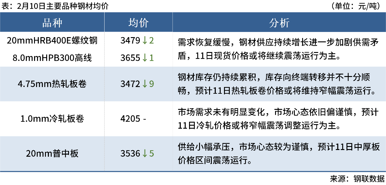◎2月10日,唐山遷安普方坯資源出廠含稅下調(diào)20元/噸,報3070元/噸。