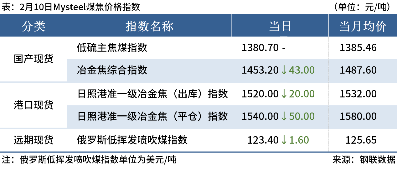 ◎2月10日,河北、山東主流鋼廠對焦炭采購價招標(biāo)下調(diào),降幅為50-55元/噸,焦炭價格目前已累計下調(diào)八輪,累計降幅為濕熄焦400元/噸,干熄焦440元/噸。預(yù)計本月焦炭仍有1-2輪的降價預(yù)期。詳情>>