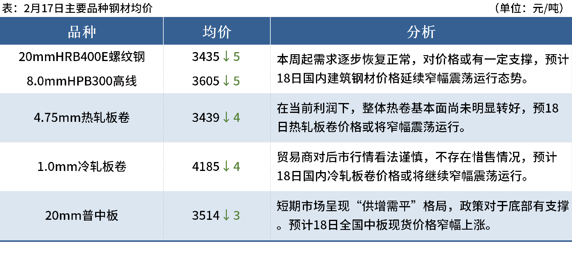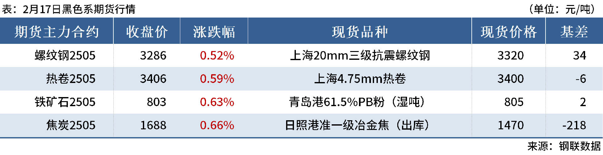 ◎2月17日,全國主港鐵礦石成交95.43萬噸,環(huán)比增24.6%;237家主流貿易商建筑鋼材成交10.56萬噸,環(huán)比增49.2%。