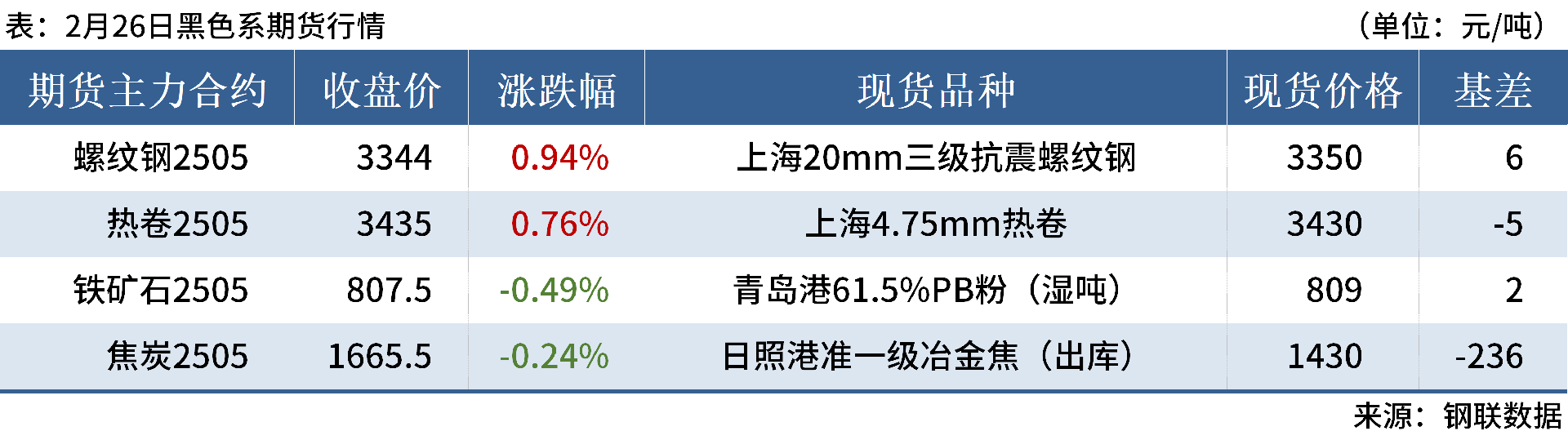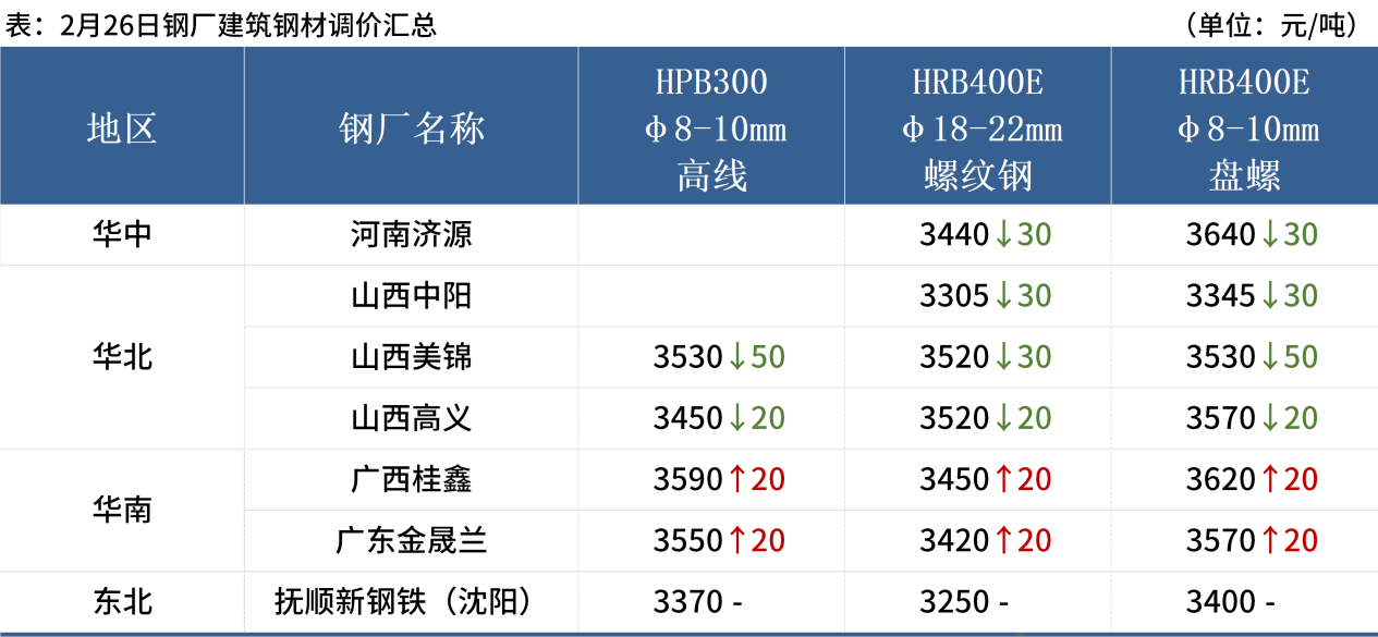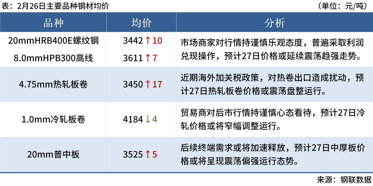 ◎ 2月26日,國內(nèi)鋼材市場漲跌互現(xiàn),唐山遷安普方坯出廠含稅價漲40報3090元/噸。