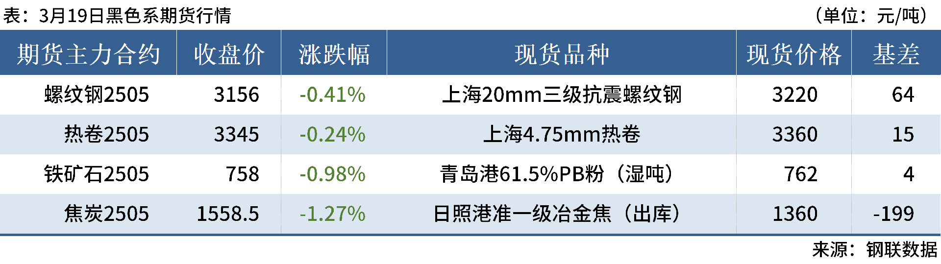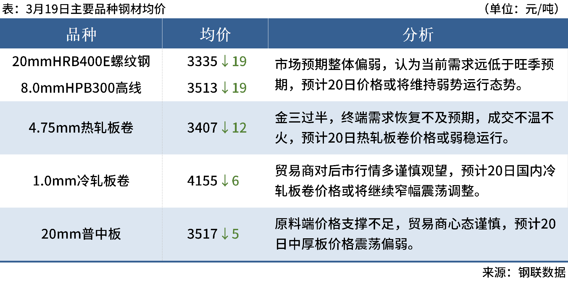 ◎ 3月19日,全國主港鐵礦石成交105.50萬噸,環(huán)比減2.9%;237家主流貿(mào)易商建筑鋼材成交9.62萬噸,環(huán)比減3.1%。