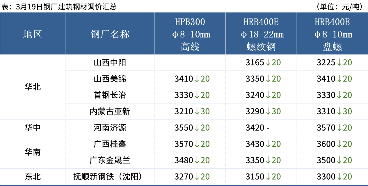 ◎ 3月19日,江蘇沙鋼廢鋼采購價(jià)格下調(diào)30元/噸,調(diào)后重三含稅2370元/噸,爐一含稅2450元/噸。