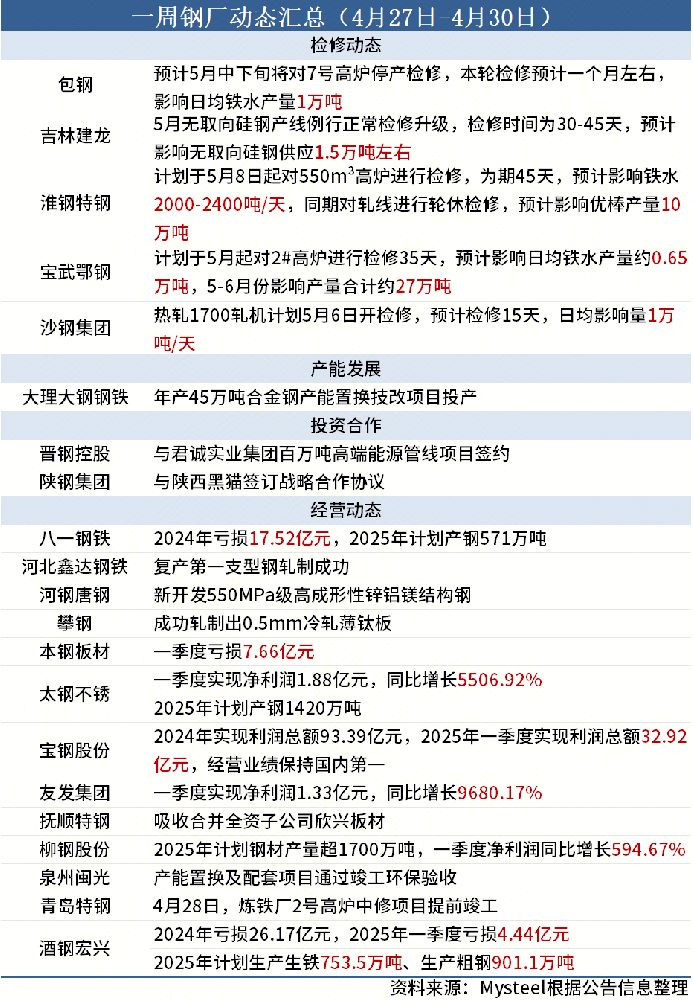據(jù)Mysteel不完全統(tǒng)計(jì),本周(4月27日-4月30日)5家鋼廠發(fā)布檢修信息,具體如下: