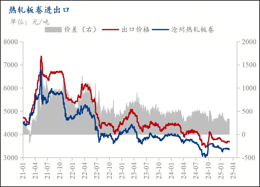 近期市場需求低價(jià)尚可,國內(nèi)消費(fèi)韌性依然存在,由于前期出口較為火爆,導(dǎo)致國內(nèi)供應(yīng)量下降,使得庫存在淡季未來臨前依然保持一個(gè)相對健康的水平。不過從近期看,內(nèi)外價(jià)差呈現(xiàn)一定收縮,在沒有買單出口的情況下,正常出口價(jià)格優(yōu)勢呈現(xiàn)明顯下降,這一情況或?qū)?dǎo)致出口需求環(huán)比呈現(xiàn)回落的過程。目前國內(nèi)熱軋產(chǎn)量會繼續(xù)維持,短期交付出口訂單的情況下,國內(nèi)供需結(jié)構(gòu)仍處于一個(gè)緊平衡狀態(tài),但其可向上動(dòng)力體現(xiàn)的則并不明確,對于海外價(jià)格的頂部抑制仍處于維持的態(tài)勢。目前市場矛盾體現(xiàn)不充分,區(qū)域間的矛盾有擴(kuò)大的結(jié)構(gòu),例如:華東和華南供應(yīng)偏少,華北和其他區(qū)域則供應(yīng)偏多,這也會導(dǎo)致南北區(qū)域間基差有擴(kuò)開的可能。從基本面角度看,5月初產(chǎn)量或?qū)⒍唐谝婍敚M(fèi)可支撐的情況下,其廠庫和社庫的矛盾不易累積。但從未來的角度考量,冷軋減量向熱軋商品卷傳導(dǎo),出口預(yù)期下降,這對于市場而言,淡季內(nèi)需+出口優(yōu)勢下降,影響到未來的供需結(jié)構(gòu)。當(dāng)前熱軋廠利潤維持在80-120元/噸的水平,投機(jī)買貨的意愿偏低,剛需拿貨為主,月底反套交單的比重依然較大。對于鋼廠而言,在手訂單則為第一標(biāo)準(zhǔn),因此價(jià)格主動(dòng)向上的彈性偏低,未來接單仍是最為核心的矛盾。從鋼廠反饋,出口訂單減少,國內(nèi)仍以基料為主,但月底光伏沖量減少,對于其訂單壓力則有上升。5月份熱軋周度實(shí)際產(chǎn)量或?qū)⒕S持在605-620萬噸/以水平,總檢修量偏低,因此矛盾累積仍需要一定時(shí)間體現(xiàn),特別是進(jìn)入淡季國內(nèi)消費(fèi)有減弱預(yù)期存在。