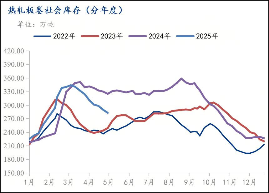 據(jù)Mysteel調(diào)研數(shù)據(jù)顯示,截至4月30日全國熱軋板卷社會庫存為282.86萬噸,較上周降6.86萬噸,較去年同期降42.08萬噸。