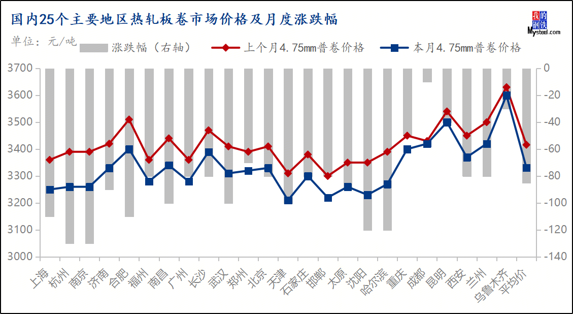 圖6:國內(nèi)25個(gè)主要地區(qū)熱軋板卷市場價(jià)格及月度漲跌幅