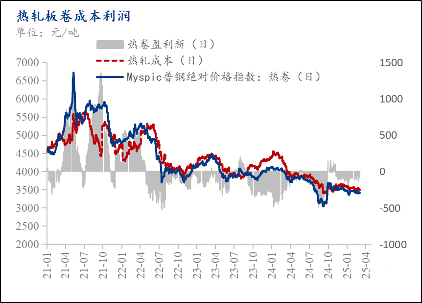 截止至4月30日,據(jù)Mysteel測算熱軋即期生產(chǎn)成本為3300.94元/噸,較上月減少94.80元/噸,Myspic熱卷價(jià)格指數(shù)為3297.78元/噸,月環(huán)比下跌36.27元/噸,熱軋即期盈利為1.96元/噸,月環(huán)比由負(fù)轉(zhuǎn)正16.37元/噸。目前由于供需雙弱,市場價(jià)格窄幅波動(dòng)運(yùn)行,同時(shí)原料價(jià)格持續(xù)走弱,預(yù)計(jì)近期生產(chǎn)成本或?qū)⒊霈F(xiàn)繼續(xù)降低的可能。