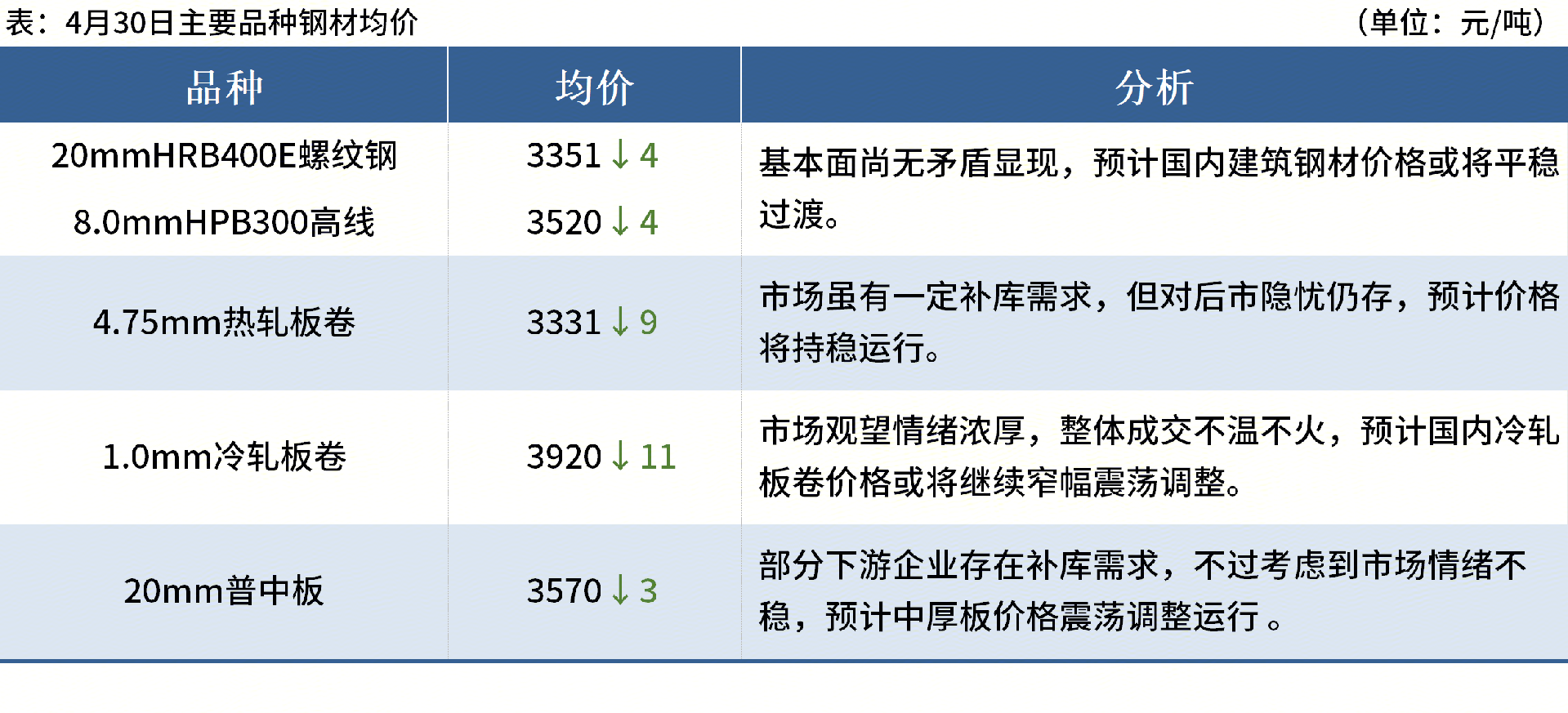 (2)建筑鋼材:各地市場現(xiàn)貨報(bào)價(jià)變化不一,鋼廠生產(chǎn)基本正常,出庫情況較節(jié)前相比明顯減少,目前廠商對于5月市場整體謹(jǐn)慎樂觀。詳情>>