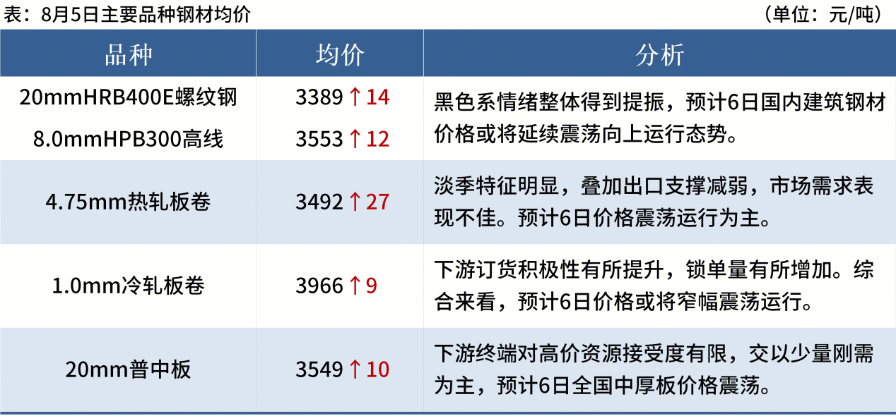 ◎ 8月5日,唐山遷安普方坯出廠含稅價上漲30報3080元/噸。