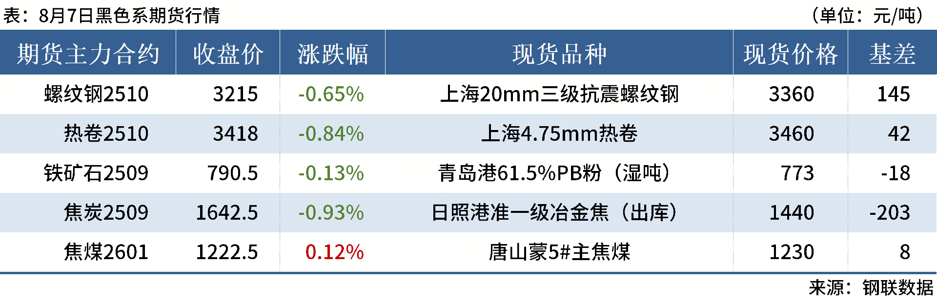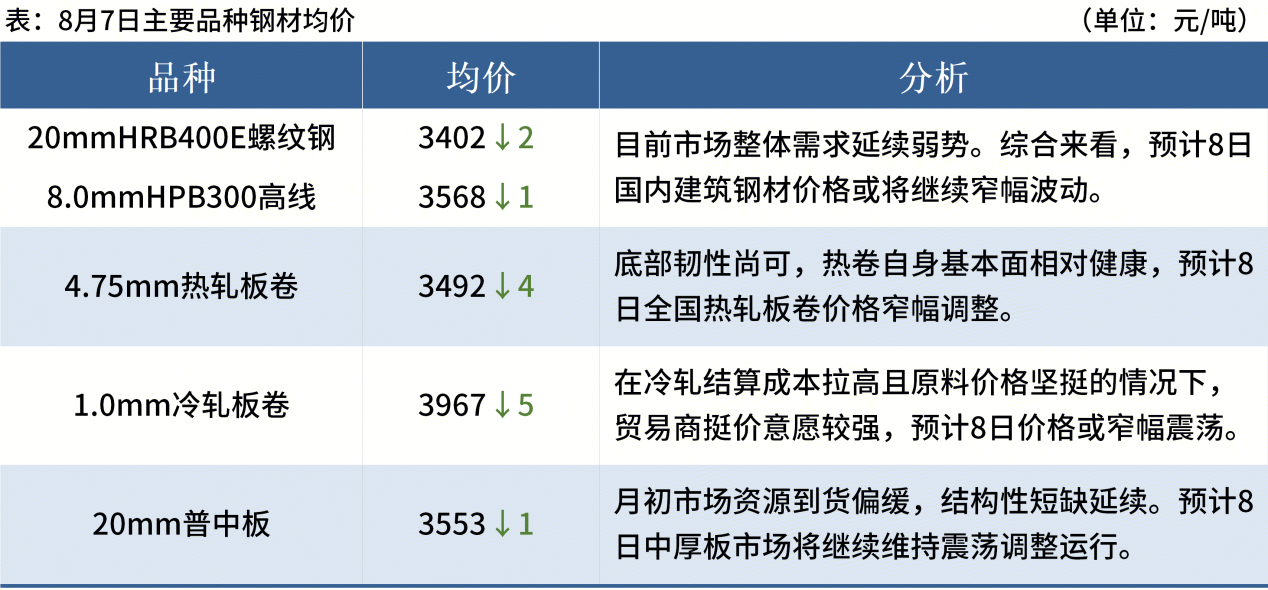 ◎ 8月7日,全國主港鐵礦石成交108.50萬噸,環(huán)比增1.7%;237家主流貿(mào)易商建筑鋼材成交9.70萬噸,環(huán)比減8.7%。