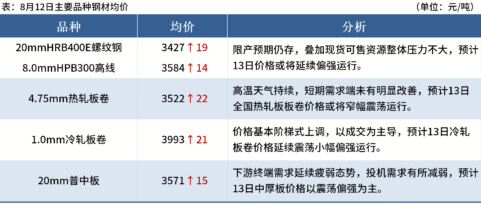 ◎8月12日,全國(guó)主港鐵礦石成交123.30萬(wàn)噸,環(huán)比減0.2%;237家主流貿(mào)易商建筑鋼材成交10.89萬(wàn)噸,環(huán)比減11%。