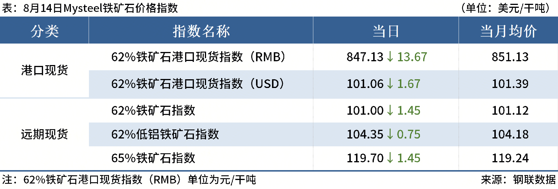 ◎8月14日,全國主港鐵礦石成交130.20萬噸,環(huán)比增54.6%;237家主流貿(mào)易商建筑鋼材成交8.38萬噸,環(huán)比減8.2%。