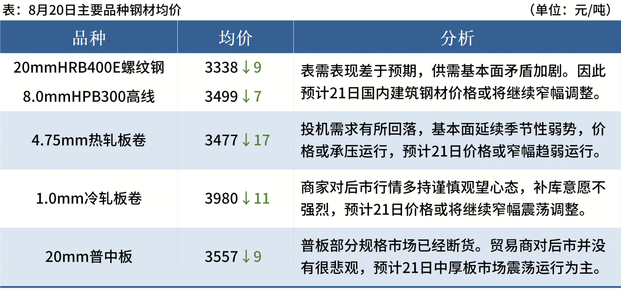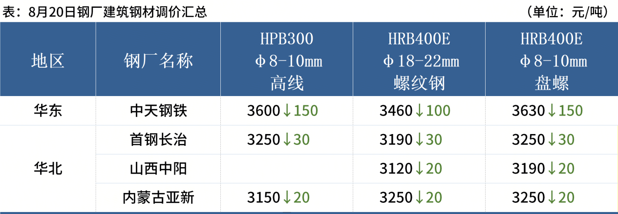 ◎ 8月20日,中天鋼鐵出臺(tái)8月下旬價(jià)格,螺紋鋼下調(diào)100元/噸,線材盤(pán)螺下調(diào)150元/噸。