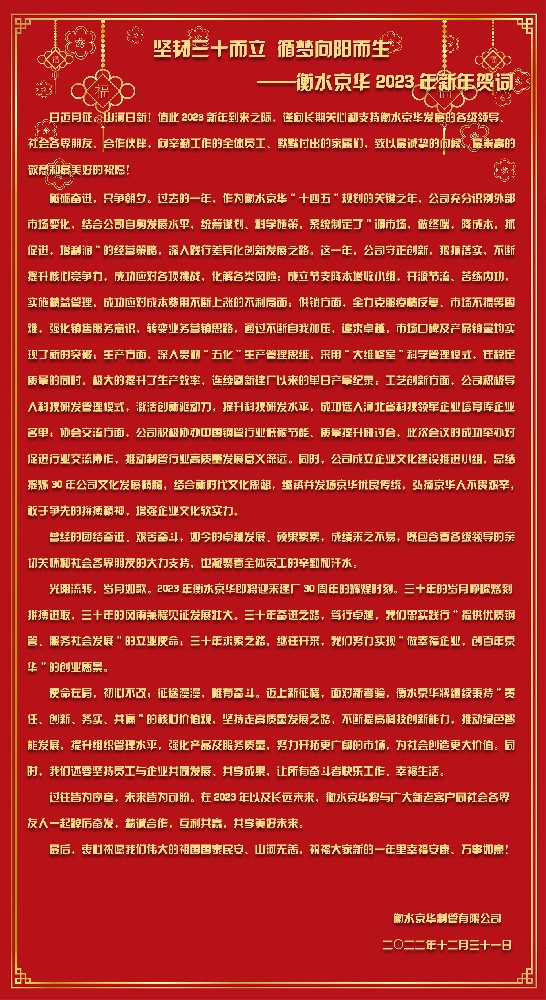 堅(jiān)韌三十而立 賡續(xù)奮進(jìn) 鑄夢(mèng)京華2023年度衡水京華業(yè)務(wù)經(jīng)理大會(huì)在衡水京華勝利召開律回春暉漸、萬象始更新!2023年2月25日,衡水京華、鄭州京華、日照京華2023年度業(yè)務(wù)經(jīng)理大會(huì)在衡水京華制管有限公司隆重召開。衡水京華、鄭州京華、日照京華相關(guān)領(lǐng)導(dǎo)及業(yè)務(wù)經(jīng)理出席了本次會(huì)議。會(huì)議主題為“堅(jiān)韌三十而立 賡續(xù)奮進(jìn) 鑄夢(mèng)京華”···